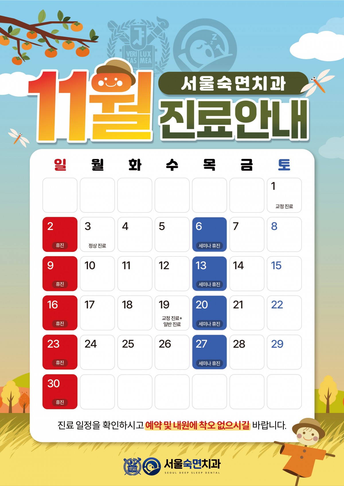 서울숙면치과 11월 진료일정 안내 페이지 정보 작성자 서울숙면치과 관련링크 본문 안녕하세요 :) 서울숙면치과 11월 진료일정 안내드립니다. 진료일정을 참고하시어 예약 및 내원에 불편함 없으시길 바랍니다.