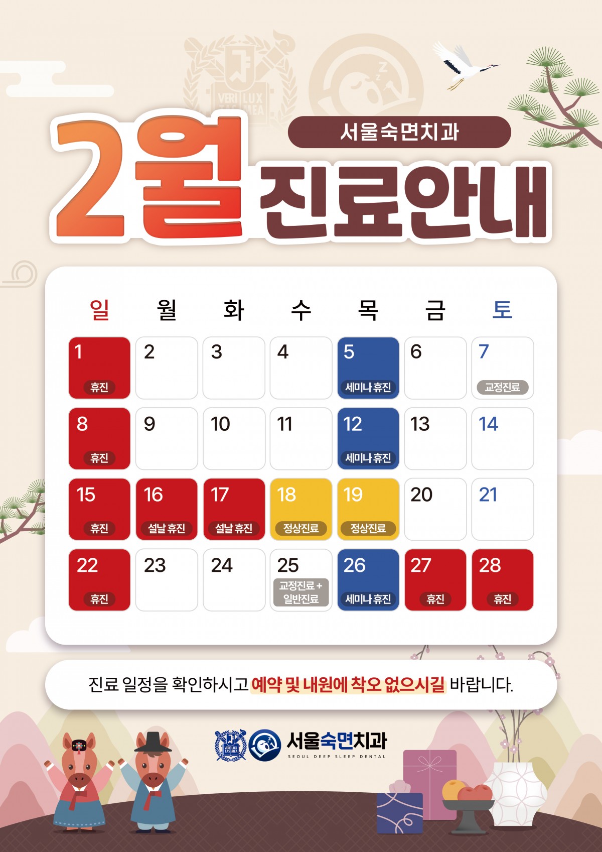 서울숙면치과 2월 진료일정 안내 > 서울숙면치과 공지사항