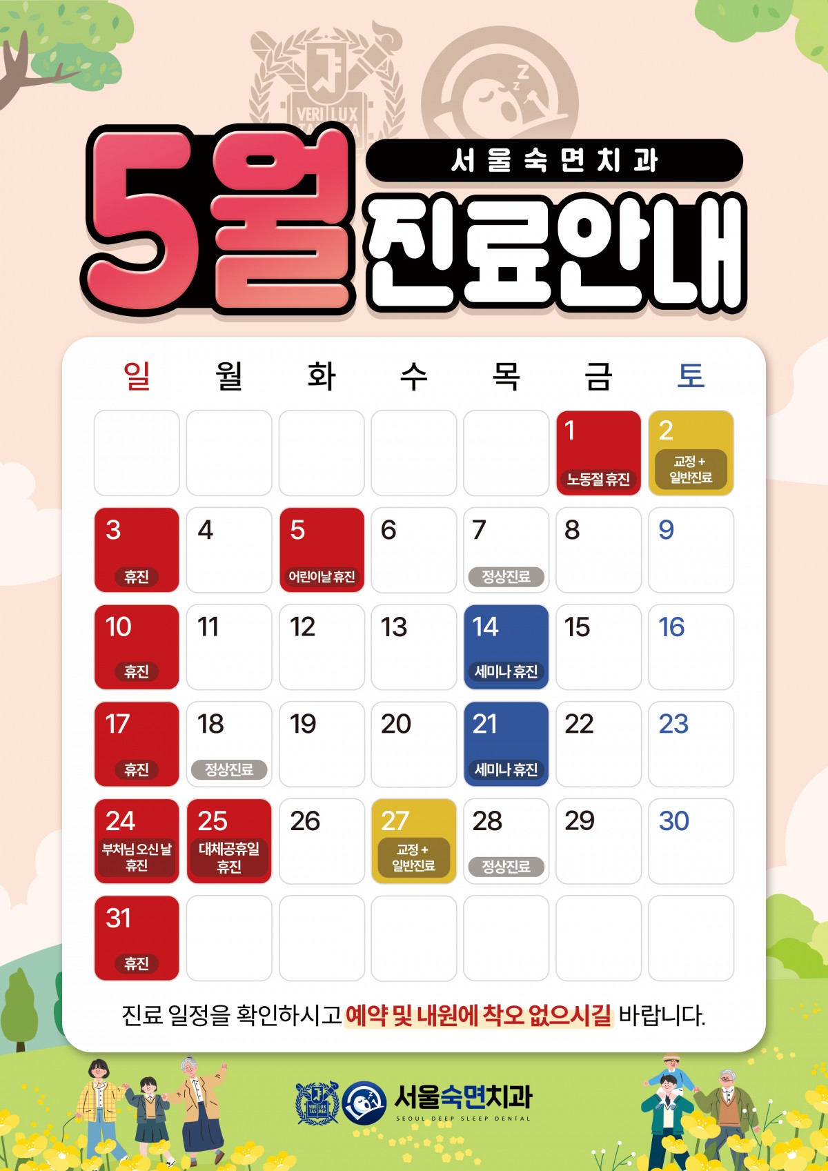 서울숙면치과 5월 진료일정 안내 페이지 정보 작성자 서울숙면치과 관련링크 본문 안녕하세요 :) 서울숙면치과 5월 진료일정 안내드립니다. 진료일정을 참고하시어 예약 및 내원에 불편함 없으시길 바랍니다.